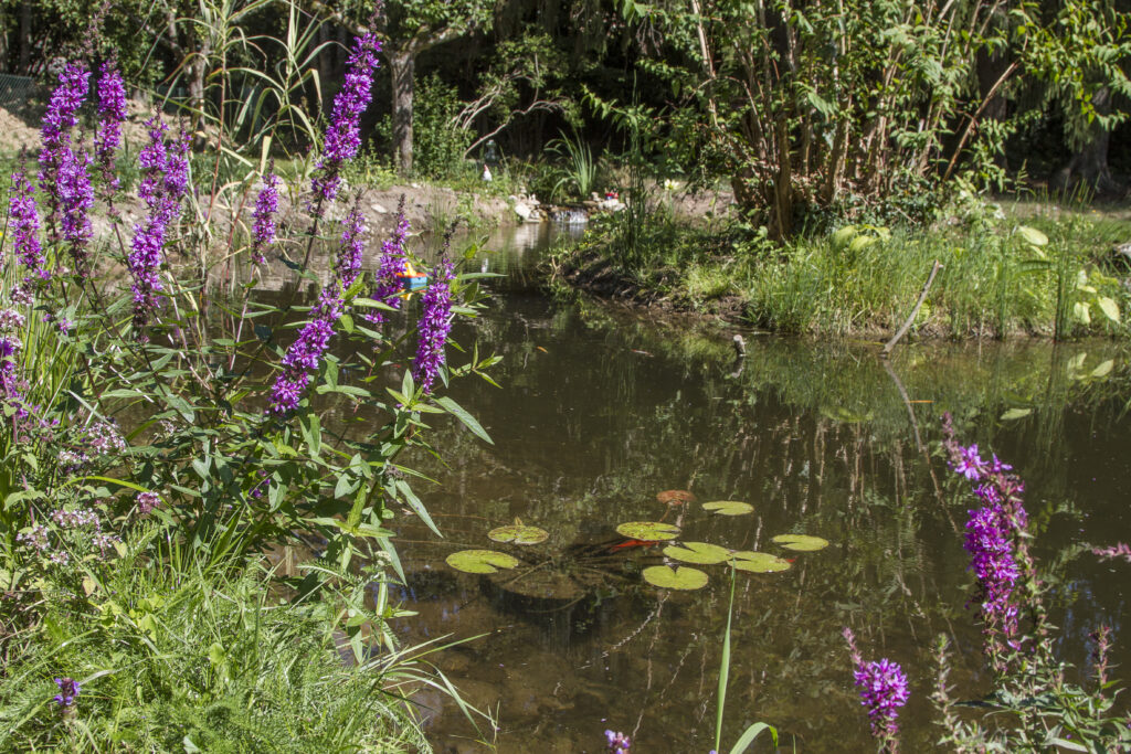 Ornés de plantes aquatiques et fleuris, l’étang est aujourd’hui une véritable réserve de biodiversité. Connaissez-vous les portes-bois ? Les dytiques, les éphémères ou le gerris ? Venez-y observer les innombrables petites bêtes qui viennent y trouver refuge. Avec un peu de chance, vous apercevrez le chevreuil s’y abreuver ou les canards y prendre leur bain en compagnie des quelques poissons rouges et carpes Koï. Au printemps, l’apparition de petits œufs en grappes est annonciateur de l’éclosion imminente de nombreux têtards. Madame grenouille s’égosille tandis que demoiselle libellule virevolte. Quand à Monsieur Martin pêcheur, ce coquin, vous le verrez poser sur une branche à guetter le poisson. En été quand il fait chaud, les enfants pourront tremper leurs petons dans la petite rivière pour se rafraîchir et laisser courir, dans un éclat de joie, radeaux et bateaux au fil de l’eau. Le paradis !
